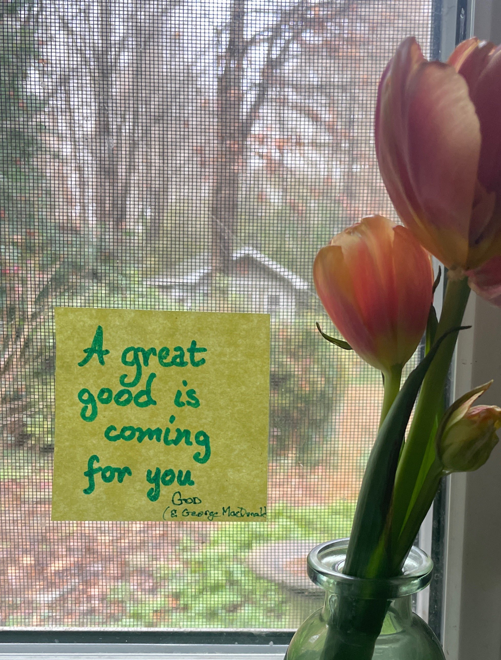 I have a sticky note on the window above my kitchen sink that daily reminds me, “There is a great good coming for you.”